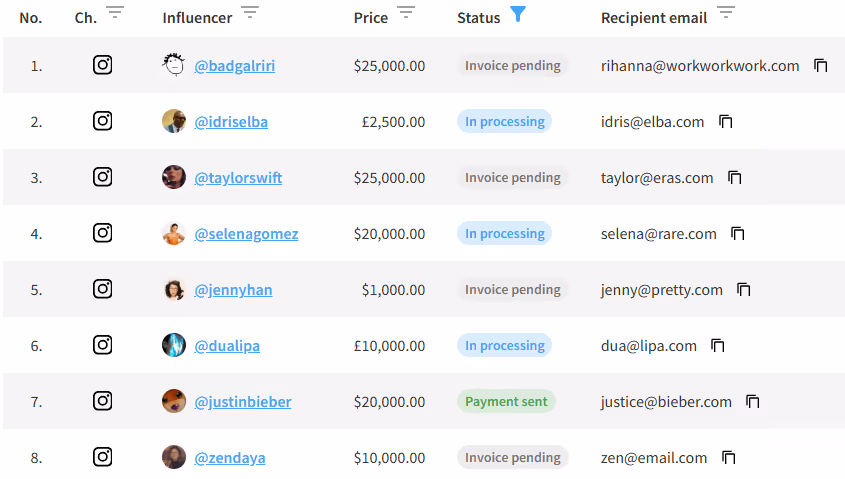 To start with, youâll want to record how much youâre spending per influencer per campaign. You can use a spreadsheet or a tool like Modash to do this.Â