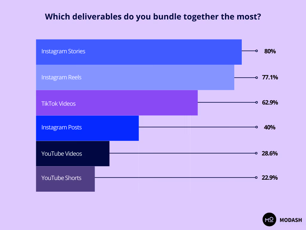So it’s no surprise to see that Instagram Stories are the most popular bundled deliverables, closely followed by Reels, while YouTube videos are way down the list.