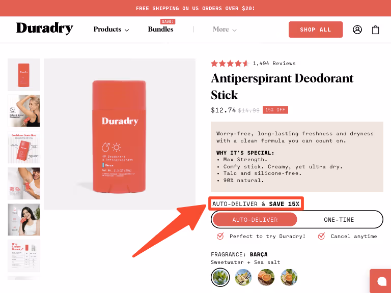 Like how deodorant brand Duradry gives customers a 15% discount for choosing a subscription over a one-time purchase: