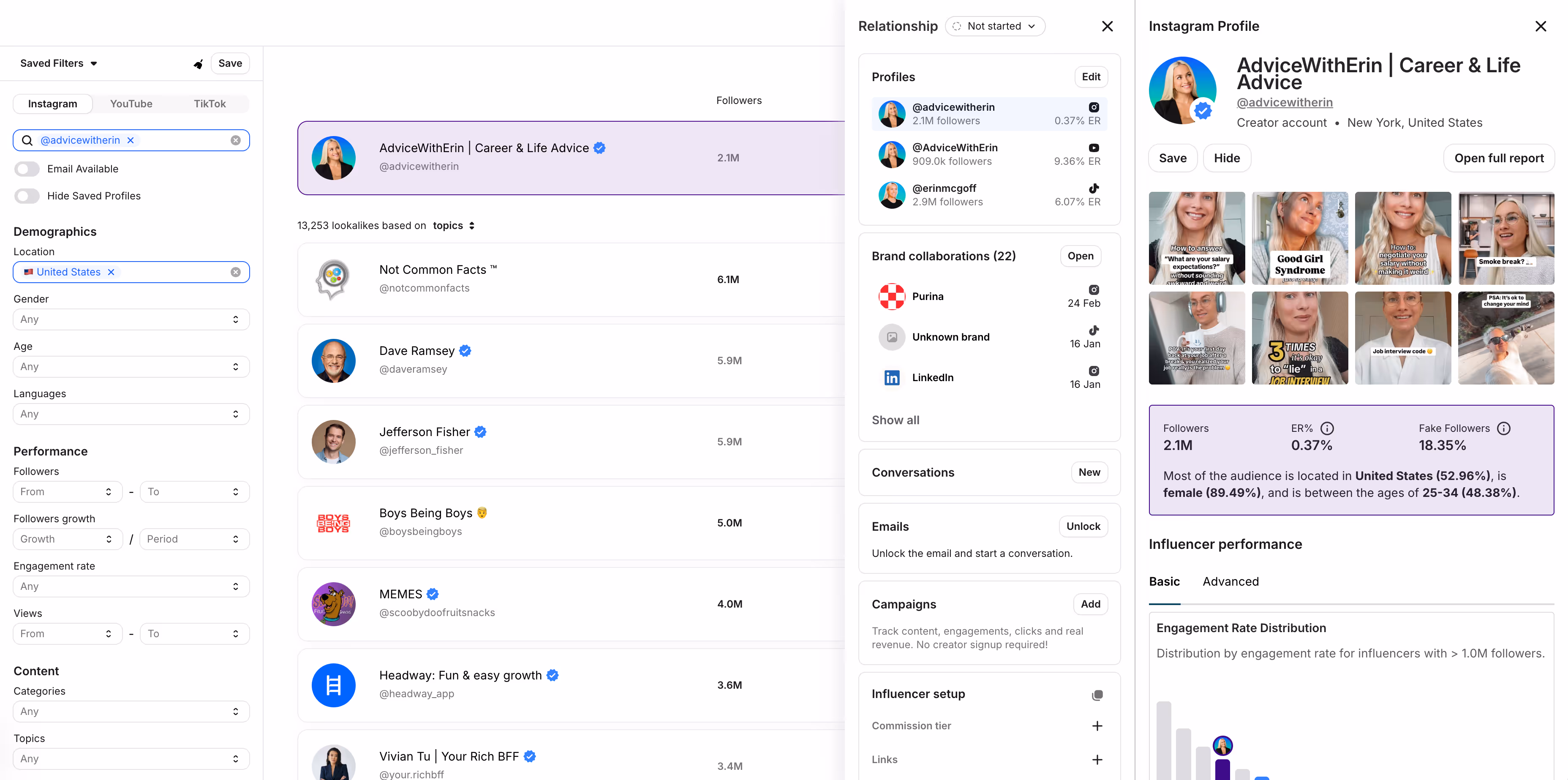 - Influencer niche and audience: you need to find influencers who are relevant to your industry. Their followers should overlap with your target customers in terms of audience location, age, gender, and more.