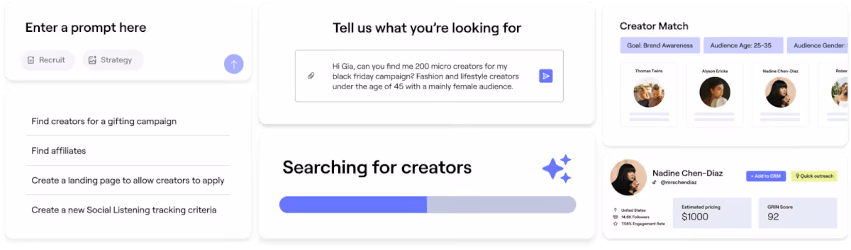 AI influencer search features: Grin doesnât have the typical AI search features, but an agentic AI assistant that can help you find relevant influencers for your campaigns. Describe your goals, requirements, etc., to Gia and evaluate the search results.