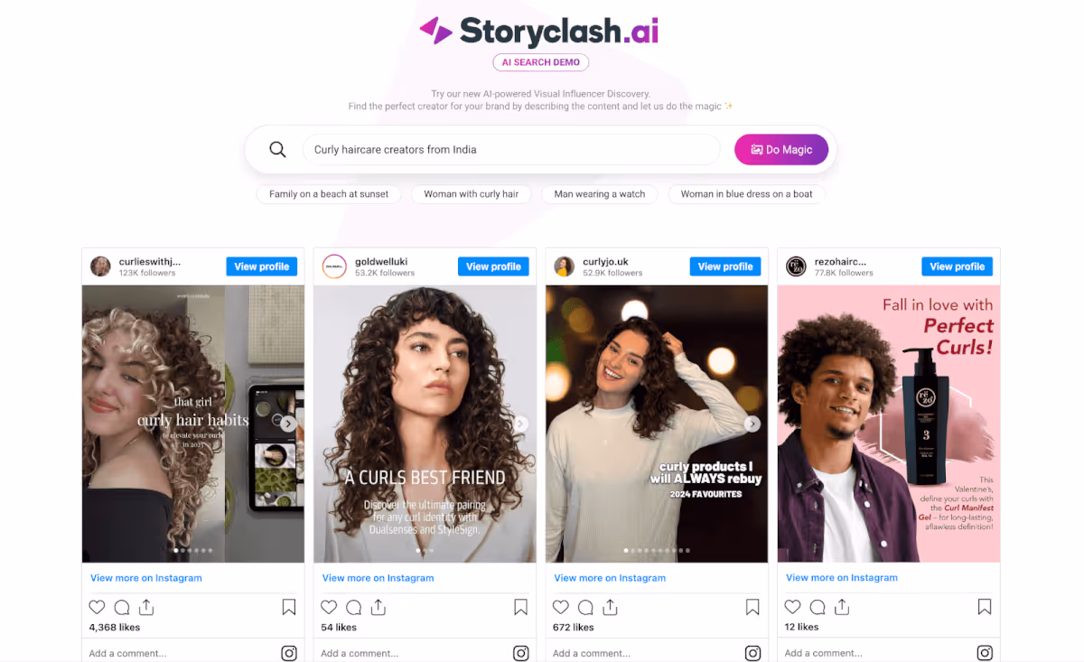 AI influencer search features: Storyclashâs AI search features go beyond the âdescribe your ideal creatorâs aesthetic/vibe in words.â You can upload an image as a reference point to find influencers with similar visual creatives. Thereâs also the option to add your productâs URL and use AI to find creators who create content around similar categories.