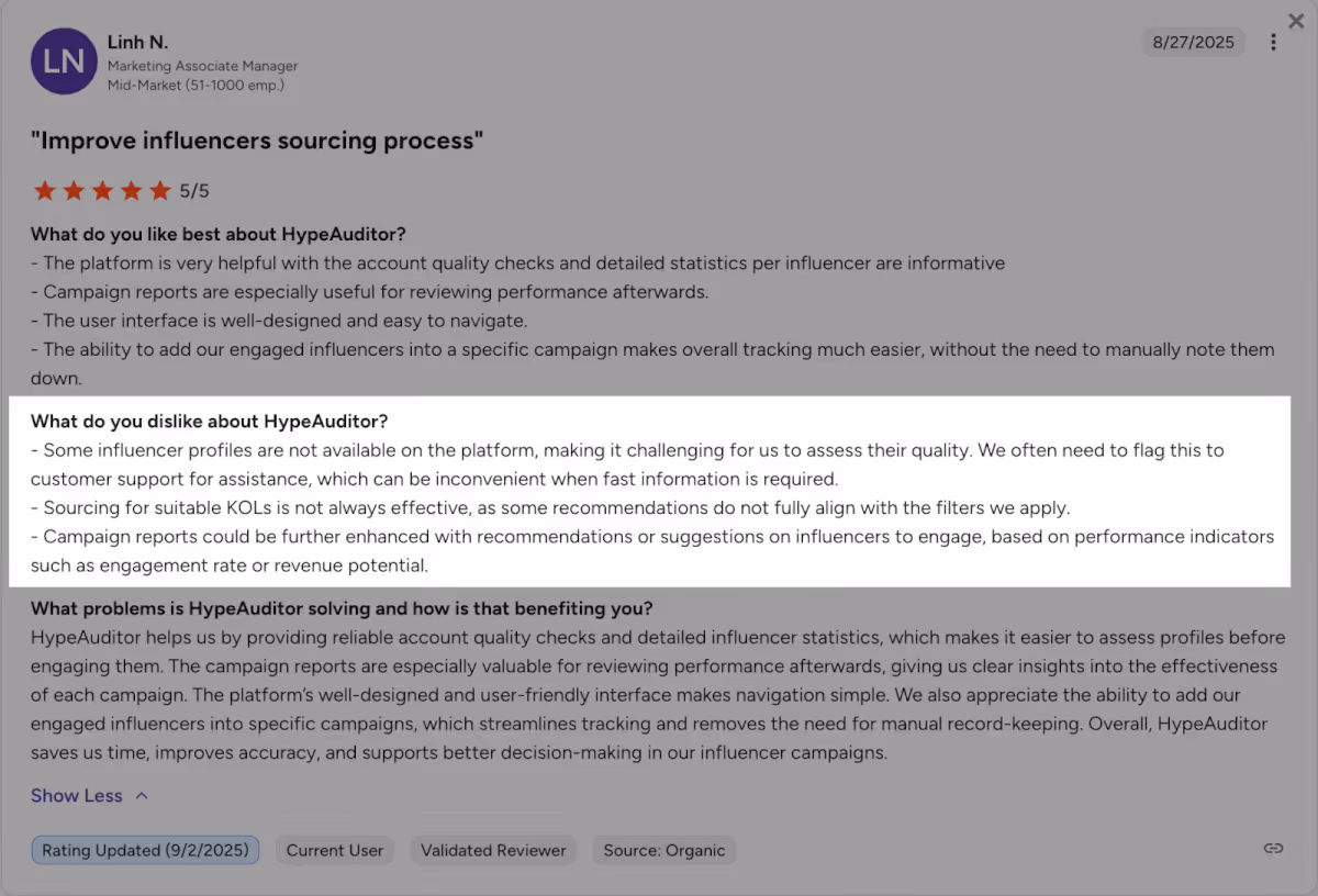 Some reviews of HypeAuditor complain about the lack of availability of their desired influencer profiles & the amount of time it takes to add them into the database to assess their quality.