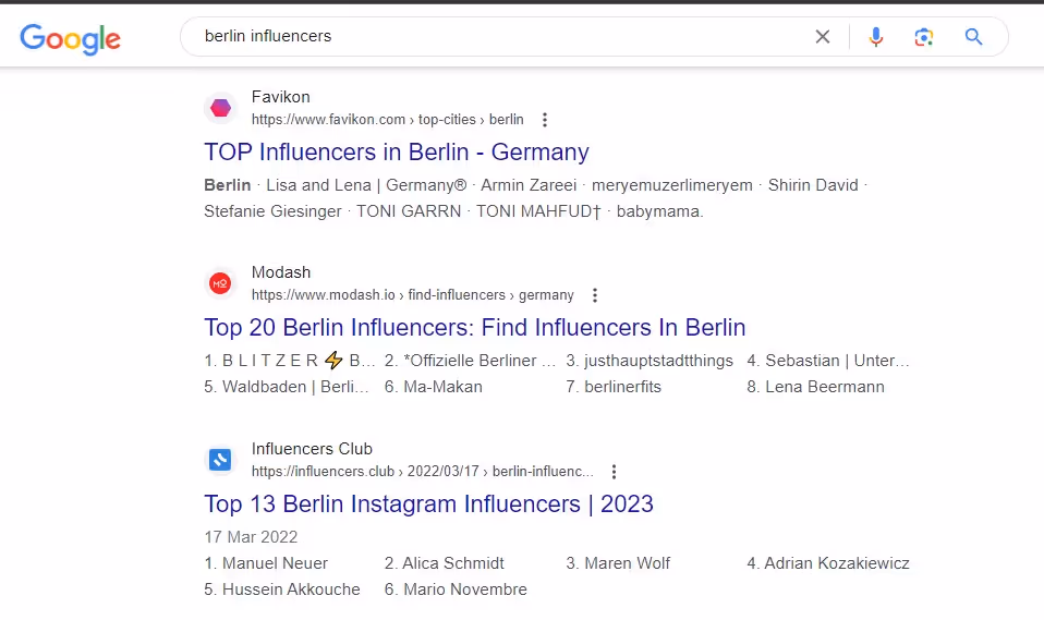 You can find curated lists or recent articles featuring beauty influencers by adding extra words like "micro" or a city/country. For example "Berlin beauty influencers" already yields some much more relevant results.