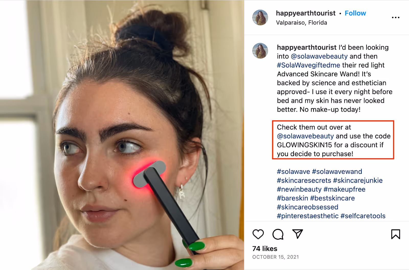 Solawave, a skincare tool company, gifted its Advanced Skincare Wand to Rachel, a travel and lifestyle influencer. The brand also gave her a discount code to share with her followers.