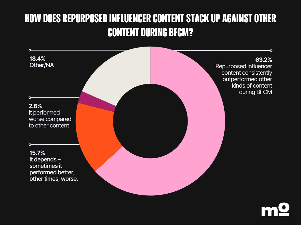 Pro tip: One of the easiest things you can do to make the influencer content you source work harder for you is to repurpose it. 73.2% of marketers in our survey said they repurposed influencer content during BFCM. And here’s the best part: 63.2% of participants said repurposed influencer content consistently outperformed other types of content during Black Friday.