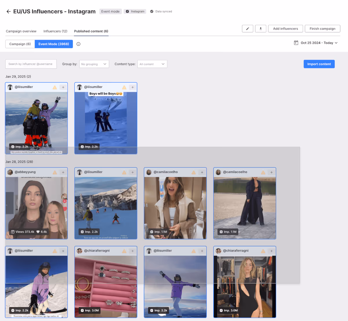Instead, automate influencer content tracking using Event Mode in Modash. You can track every piece of content your creator partners post – regardless of brand mentions, tags, and whatnot – and then manually select which posts you want to add to your BFCM campaign for performance analysis.