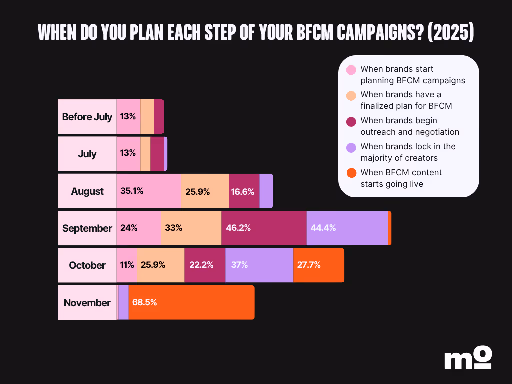 While the responses are definitely varied, the results are similar to last year: on average, marketers start planning BFCM promotions in late July and they have a finalized plan by mid-August. Almost all creators are hired as September inches to a close.