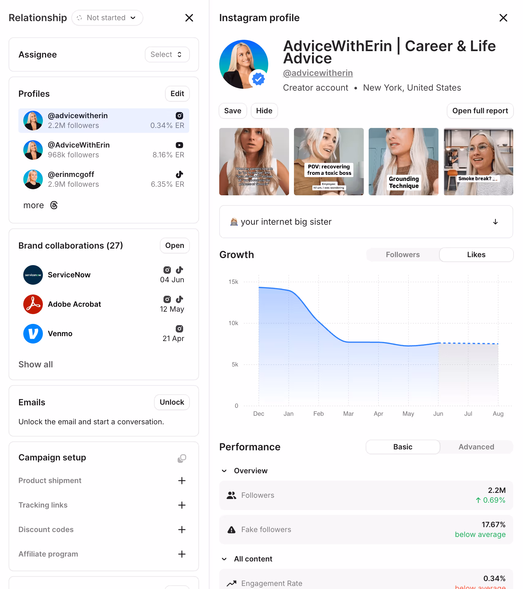 And it makes sense â using software is an efficient way to vet each creator for basic metrics like engagement rate, fake followers, and sponsored post performance. Using Modash, you can also dive deep into their audience demographics, follower growth, overall impressions, and more.
