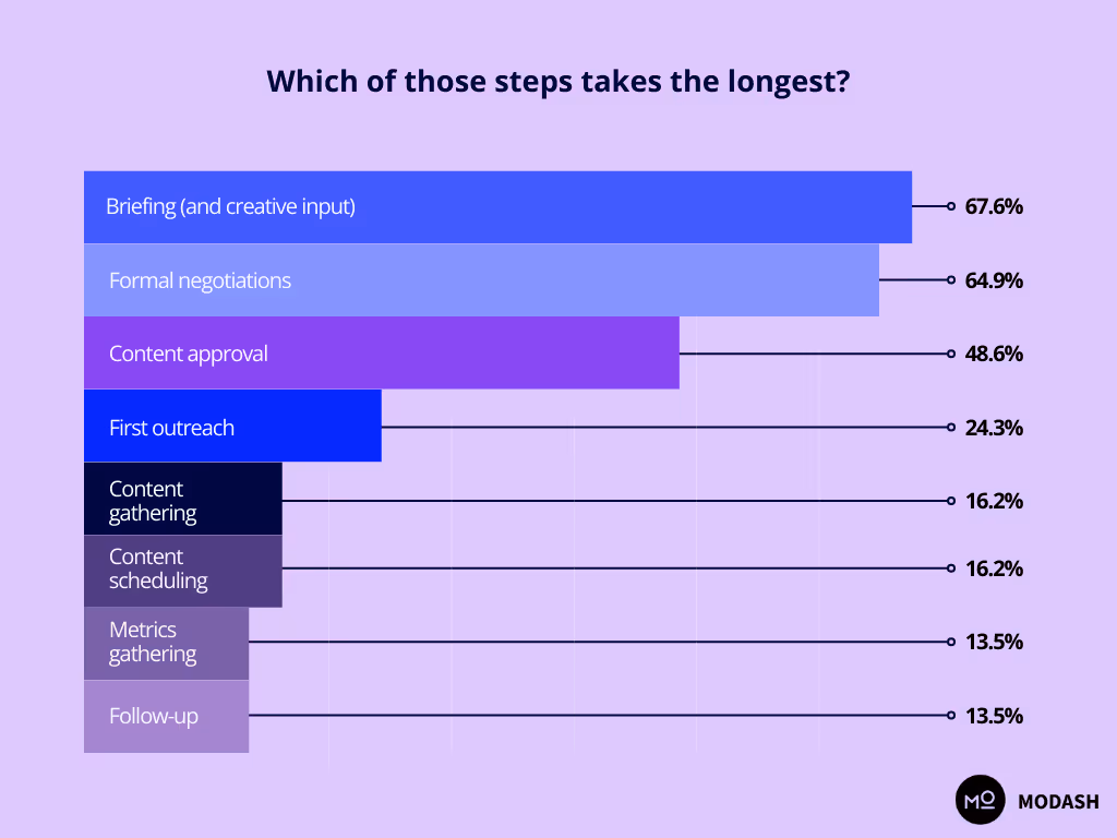 I asked influencer marketers which communication steps take the longest – and over 67% of marketers ranked briefing (and creative input) as the most time-consuming step, followed closely by formal negotiations and content approval, respectively.