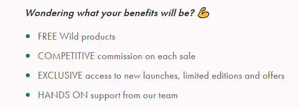 Wildâs ambassador programme page also gives us a good example of adding low-cost incentives for recruiting affiliates. They offer extra free products and exclusive access to new products & offers.