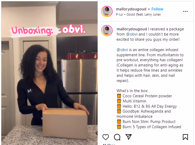 Hereâs one creator, @mallorydougoud (~25k followers) who received products from Obvi: