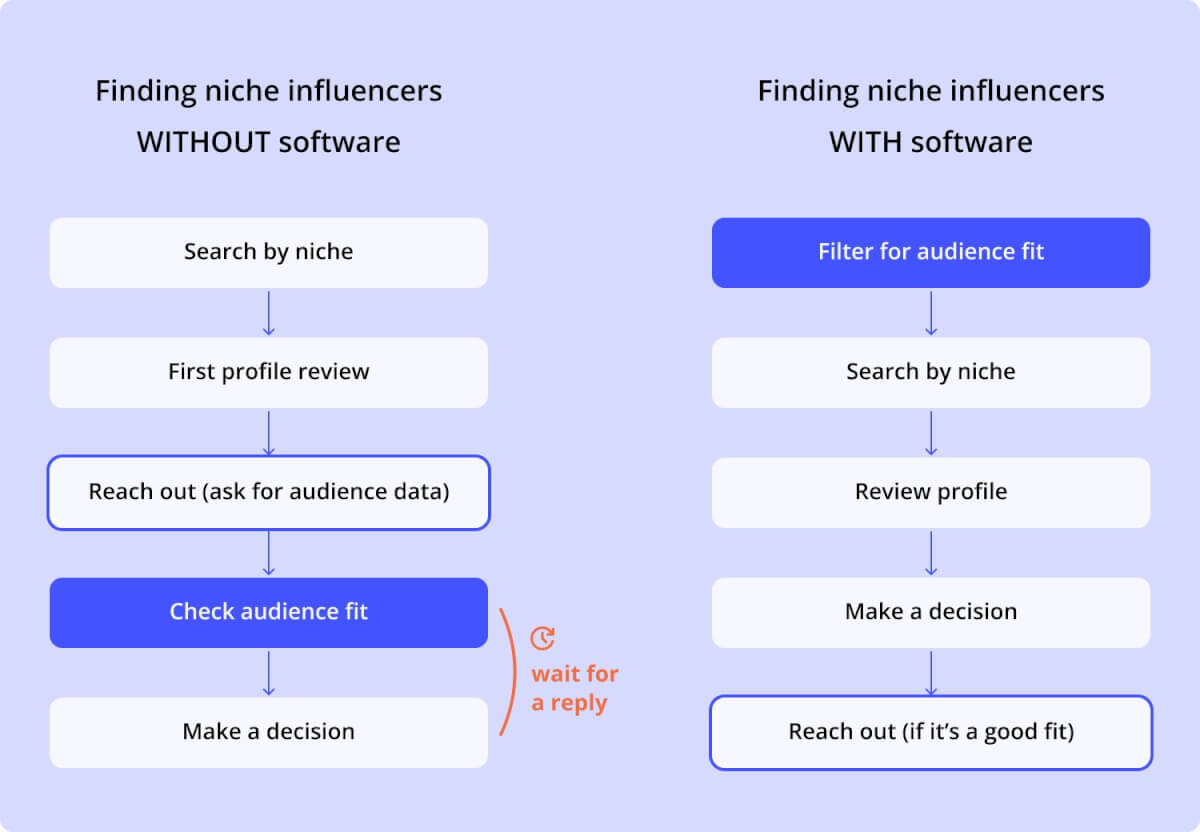 - If you’re using software to hunt for influencers, you’re filtering for audience fit upfront. You’re spending time filtering and searching so you can dedicate all your outreach time to influencers who you surely want to convert.