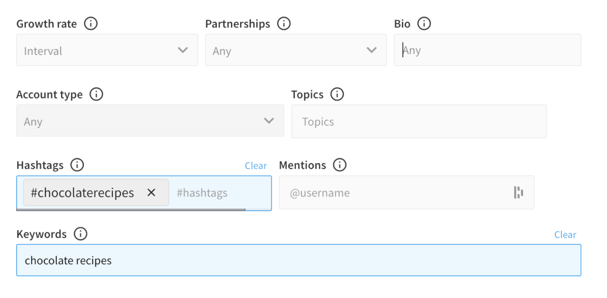 To narrow it down further, you can use bio, keywords, and hashtag filters, too. Let’s say you want to search for creators who are making chocolate desserts. You can enter “#chocolaterecipes” hashtag and “chocolate recipes” in the keyword filter.