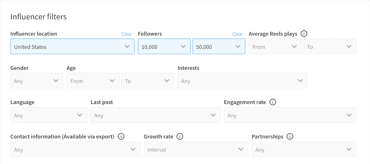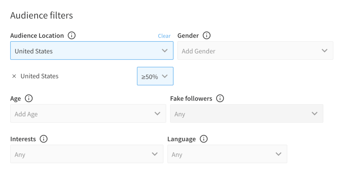 Next, use audience filters to target your ideal customers’ demographics. For example, you can find influencers with at least 50% of their followers in the U.S.