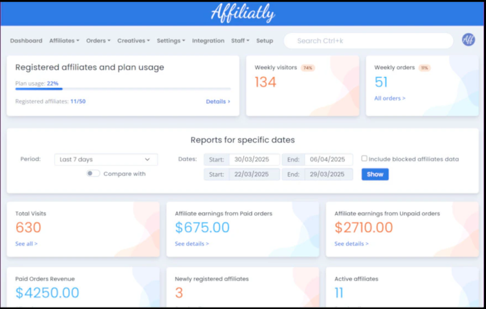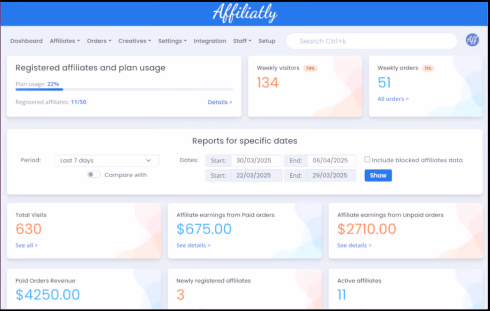 What is it: Affiliatly is one of the most affordable affiliate management software for ecommerce brands. The tool connects with Shopify, BigCommerce, WooCommerce, etc., just like GoAffPro.
