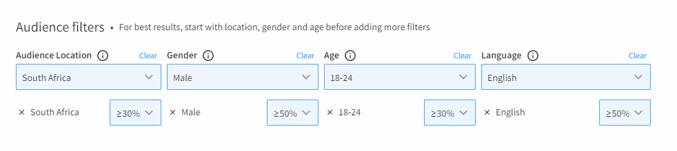 Each can be controlled with a percentage filter too. Very few creators are going to have 100% of followers in South Africa, for example. So to broaden my search, I could specify that the results should have at least X% of followers in my target country.