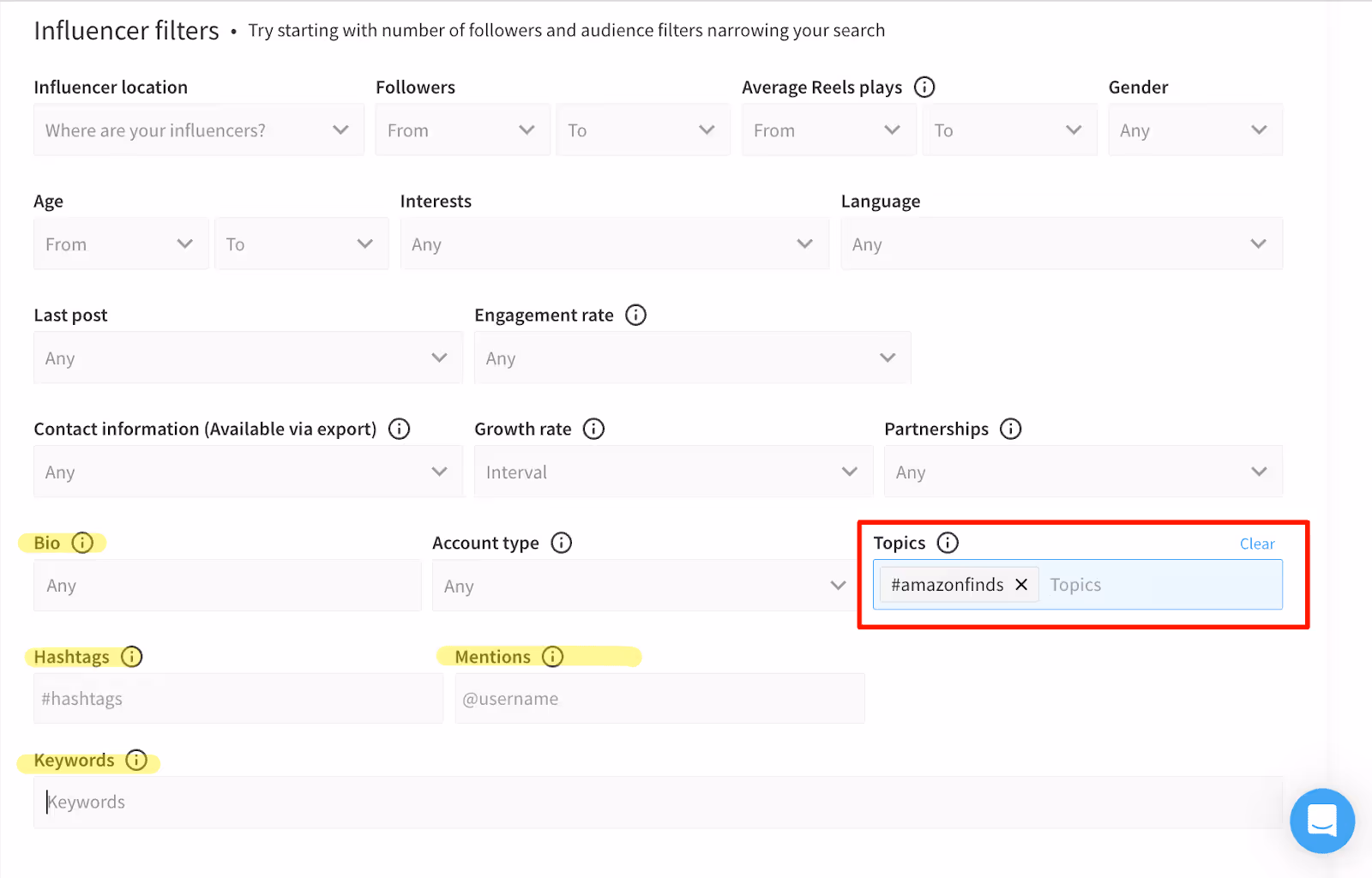 - For searching specifically for Amazon influencers, apply Amazon-related filters on bio, topics, hashtags, and keywords. For example, in the bio and hashtag filter, search for “Amazon Finds” or “Amazon Deals” and in the mentions filter, you could search for “@amazon” or “@amazonfashion,” depending on your niche. Once you discover a few Amazon influencers, see what keywords or accounts they mention and search using those on Modash to find similar creators.