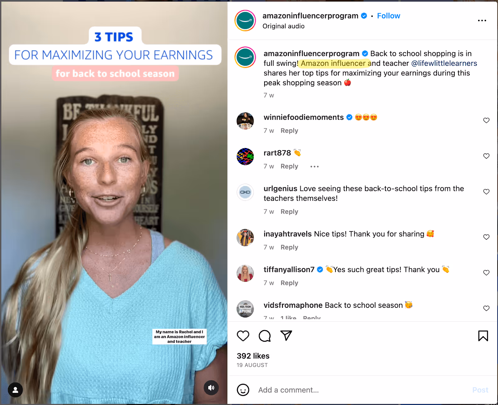 Beyond the Amazon website, Amazon is also active in promoting its creators on social media. It has specific accounts on Instagram, TikTok, and YouTube to highlight its creators. In this Instagram post, for example, Amazon influencer and teacher, Rachel, shared her top three tips to sell more during back-to-school season.