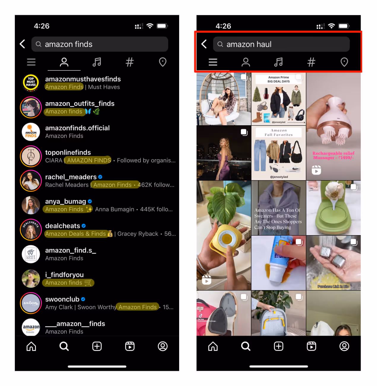YouTube and Instagram have excellent search engine capabilities. Search for Amazon-related keywords like “Amazon finds” or “Amazon haul” to find influencers with Amazon storefronts.