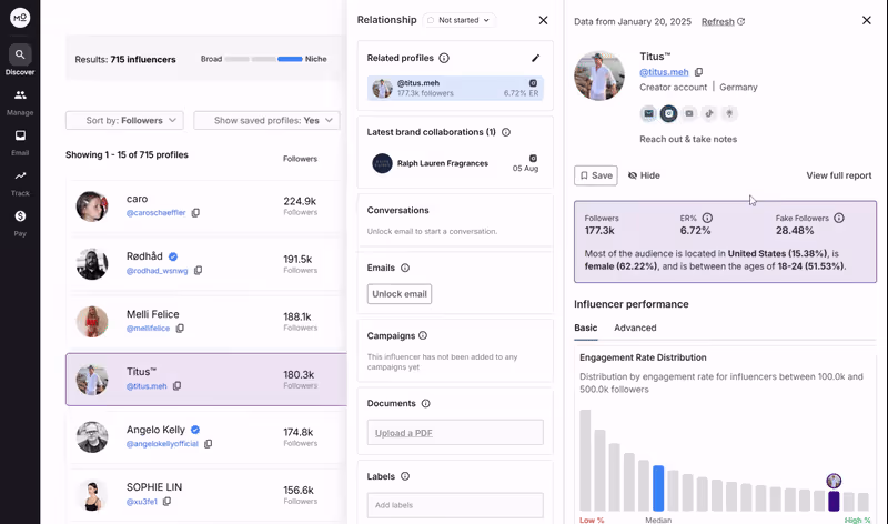 Modash makes it easy to identify influencers who match your search criteria, analyze their audience and performance metrics, and explore their existing sponsored content â all without having to reach out first. If theyâre a good match, just add them to an automated email sequence. Easy!