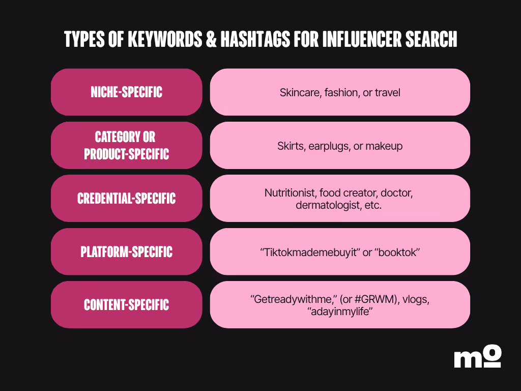 Most marketers are using five main types of hashtags or keywords to manually search for influencers on social media: