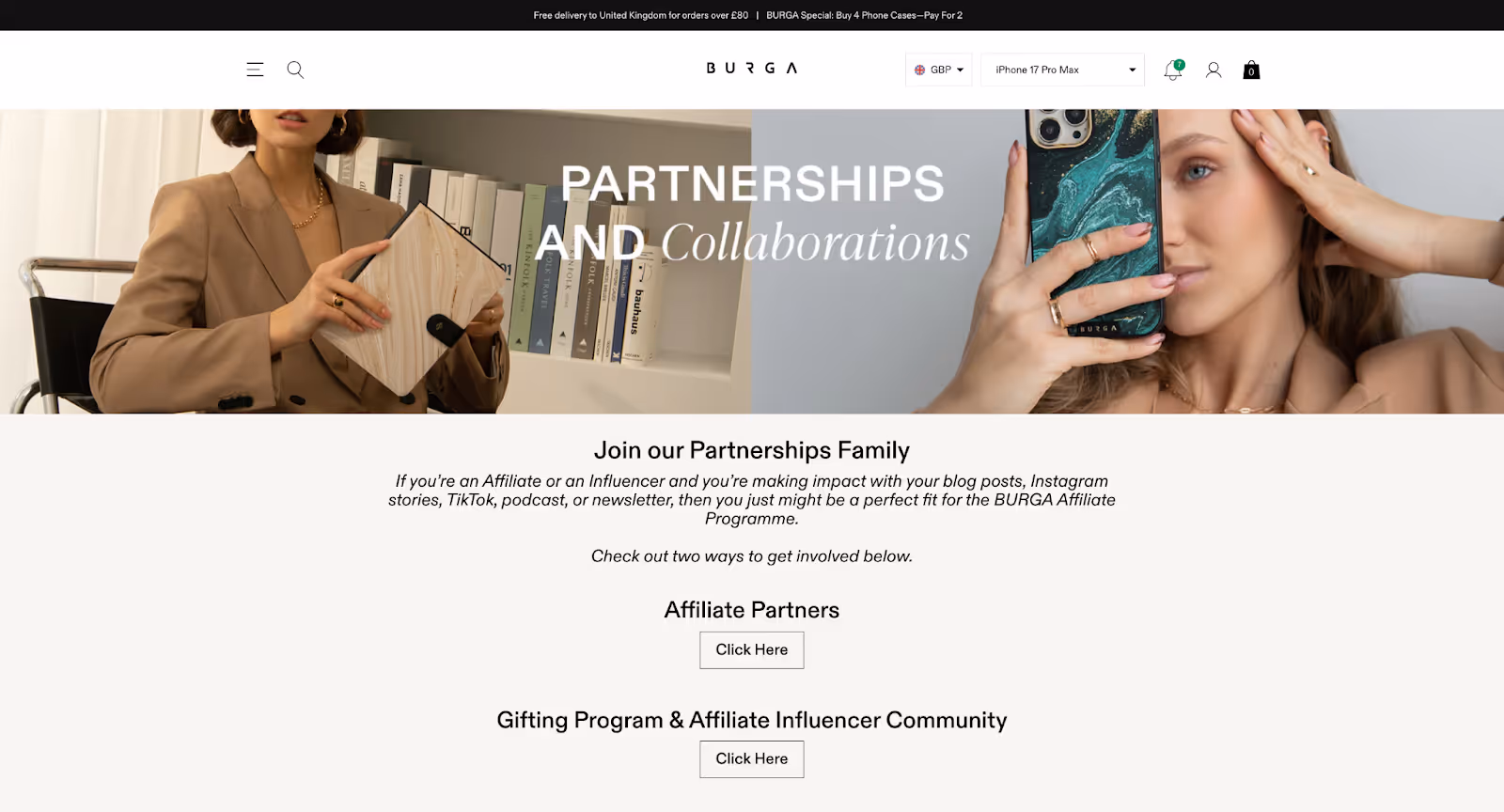 - Create a landing page for your ambassador program so would-be influencers can easily sign up, just like accessories brand BURGA does here: