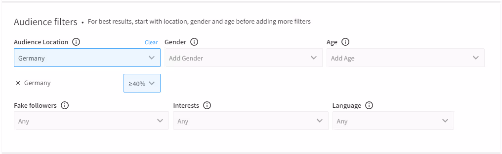 Optionally, I can layer more filters for the audience. Here, I've simply specified that at least 40% of their audience should be located in Germany.