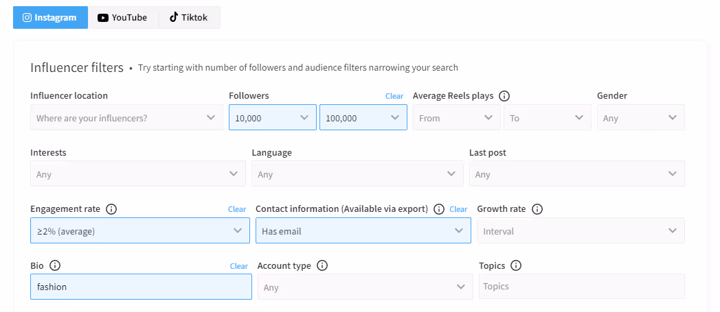 In this example, I'm looking for fashion influencers with 10-100k followers, a minimum of 2% engagement rate, and an email available.