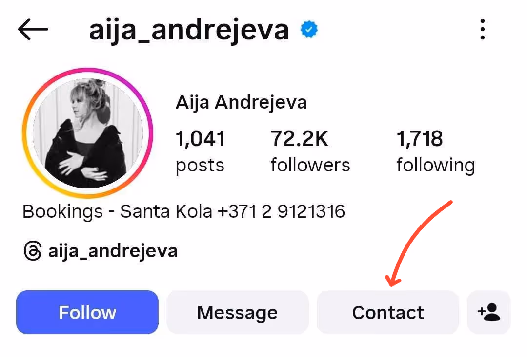 As you can see, no email address. On mobile though, finding an Instagram email is easy. It's tucked under the "Contact"Ā button.