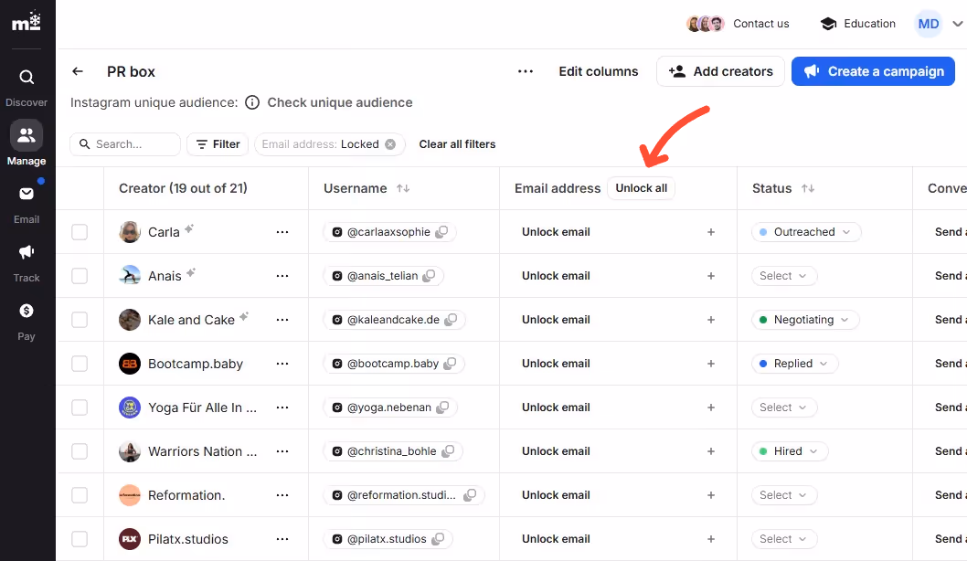 You create (or import) a list of Instagram profiles (it can be 1-2 profiles, or hundreds). Then, you can either grab emails one by one using the āunlockā buttons, or export them in bulk.
