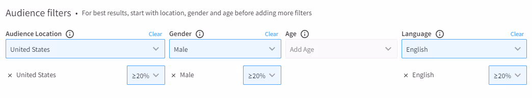 Next, audience filters. If my target market is English-speaking males in the US, then I need to make sure any potential partners have the appropriate audience. Here, Iâve specified that Iâd like to see channels with at least 20% of their audience fitting my target persona.