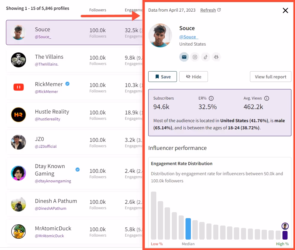 Quick bonus: before saving the YouTuber to a list, you can open up a profile and get a sidebar with their full profile analytics. That includes audience demographics, recent & most popular content, engagement rate, and more. It looks like this (you can scroll the sidebar down further):