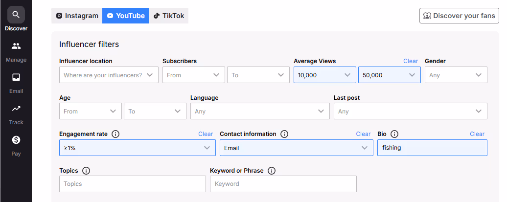 Here we have our desired average view count, a minimum engagement rate, and a topic (fishing). The contact information filter ensures I only get profiles that have an email address available.