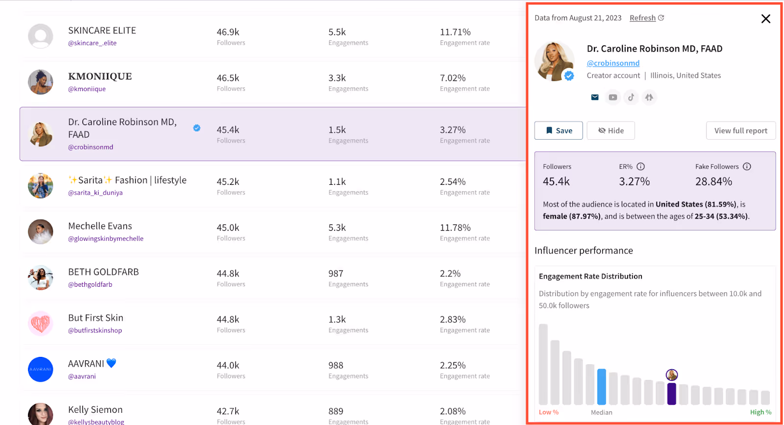 - You have all the inside info on your ambassador’s performance without asking them. Modash provides a detailed analytics report for every influencer — their audience demographics, engagement rate, sponsored content, fake followers, and so much more.