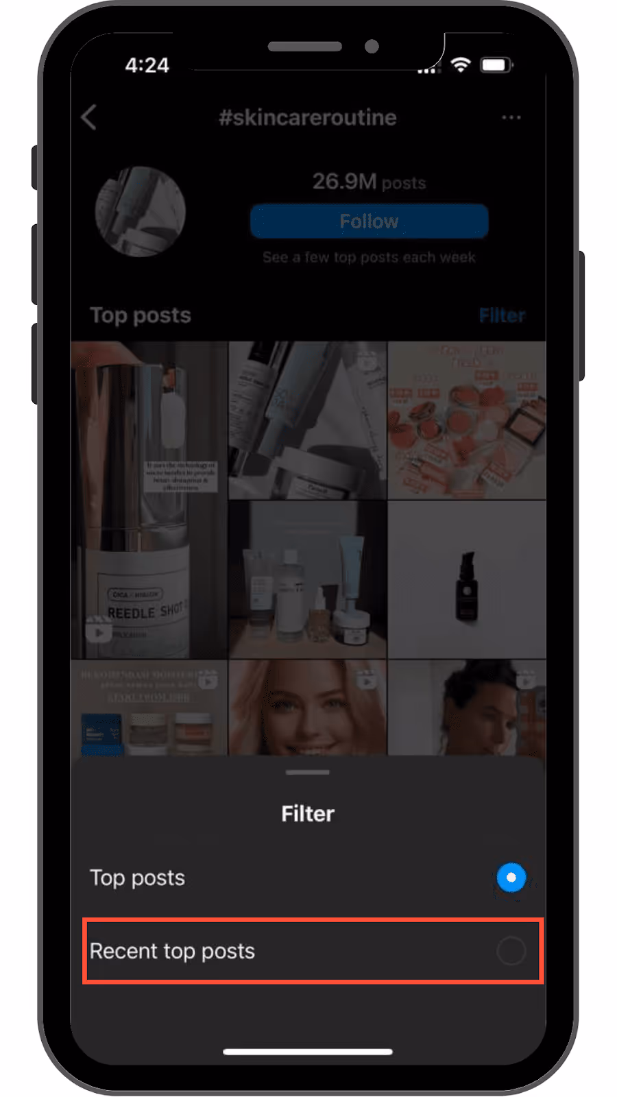 ⚡Pro-tip: when searching for hashtags, search for ‘recent top posts’ using the “Filter” option along with ‘top’ posts that appear automatically. Top posts are usually the ones that are performing well for that particular hashtag and might be populated with famous, expensive influencers. Recent posts give you the posts in chronological order from latest to oldest.