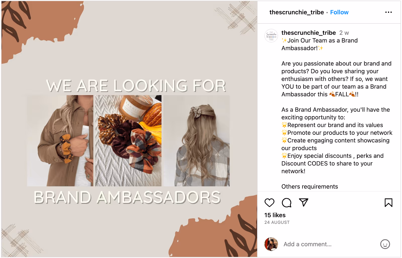 This social media post by Scrunchie Tribe is a perfect example of announcing you’re accepting ambassador partners for your brand ambassador program.