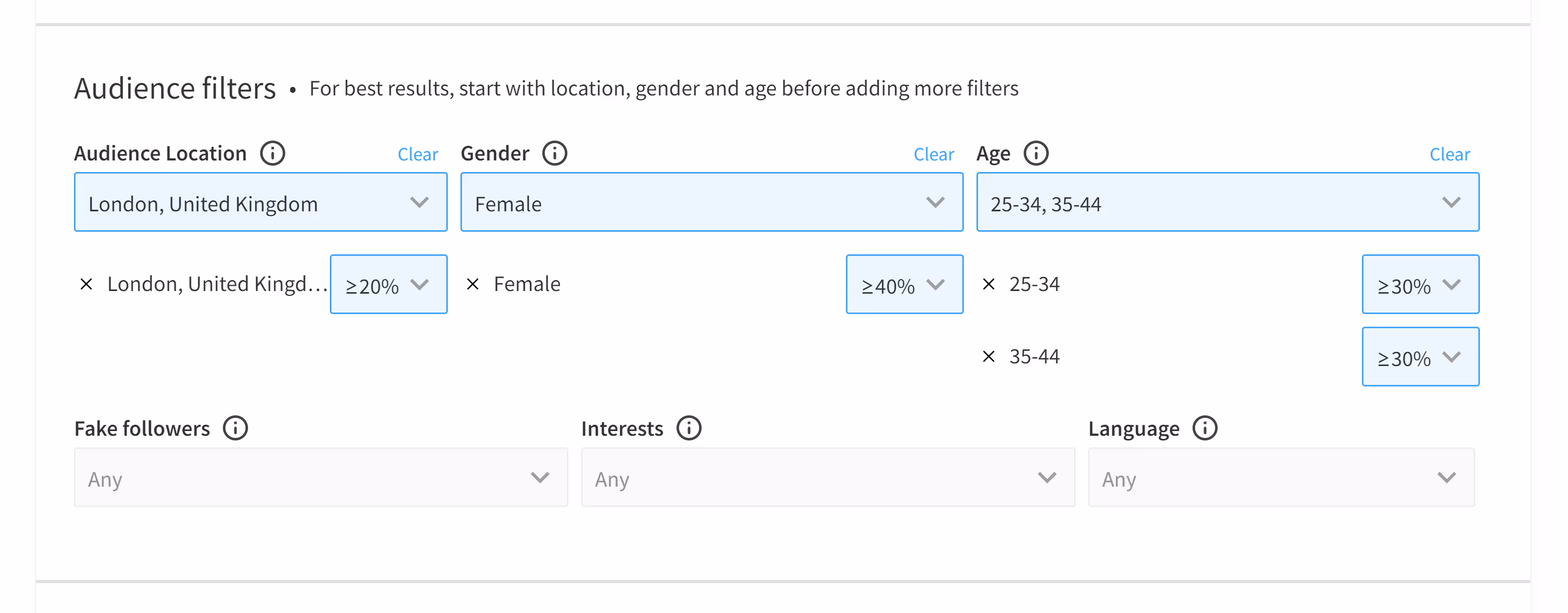 Once you’ve found influencers with the right audience you can begin to narrow down your search by other characteristics. For example, if you have a smaller budget, try only focusing on influencers with a follower count of 1000-10K.