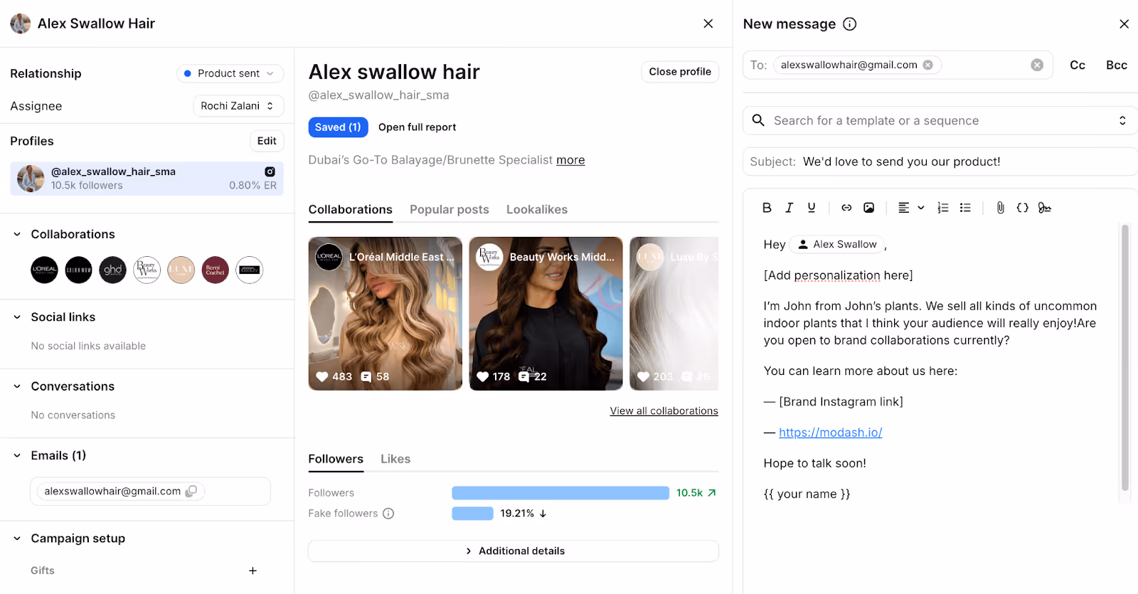 - Influencer outreach: manage your influencer outreach efforts from Modash itself â track who responded, who you need to follow up with, who received your products, etc. Set up automated follow-ups that stop when a creator replies.