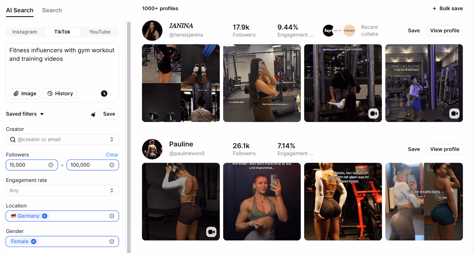 - Influencer discovery: you can find creators of all sizes & niches and analyze their profiles. Modash has a database of over 350M+ creators. Just apply the filters to find plenty of influencers who meet your criteria. You can also use their AI search to discover creators using natural language search.