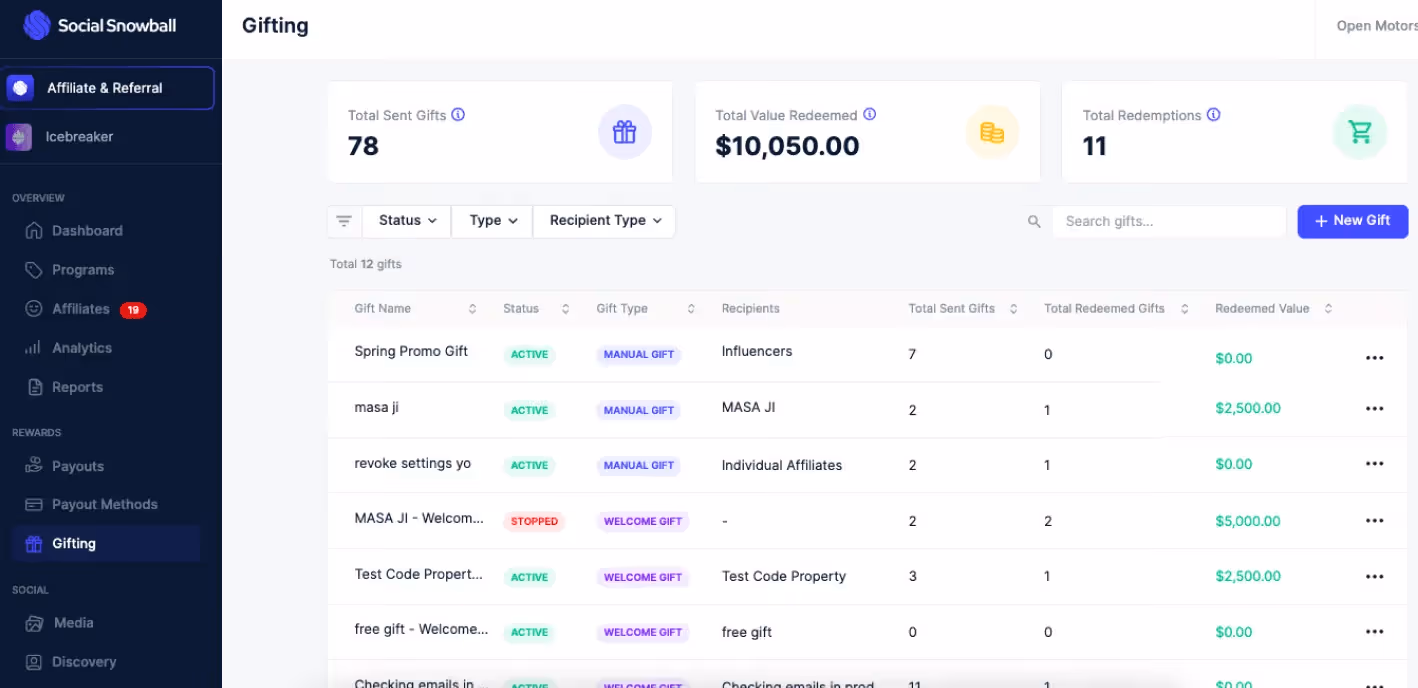 Influencer gifting features: Social Snowball lets you send gifts to your affiliates (who are onboarded on the tool already). Your affiliates receive a notification that youâve sent them a gift â they can redeem it after entering their shipping info.