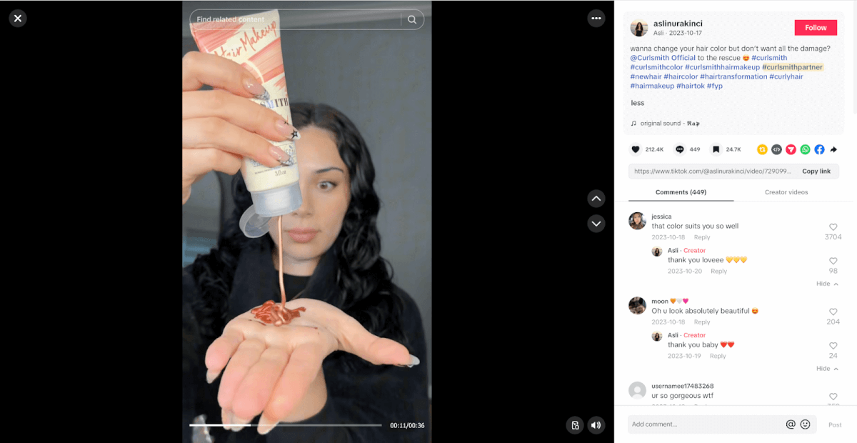 The partnerships on TikTok are focused on Curlsmith brand ambassadors. Curlsmith has a program that allows anyone with a public profile on Instagram or TikTok to apply.