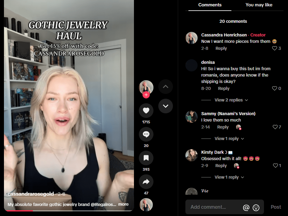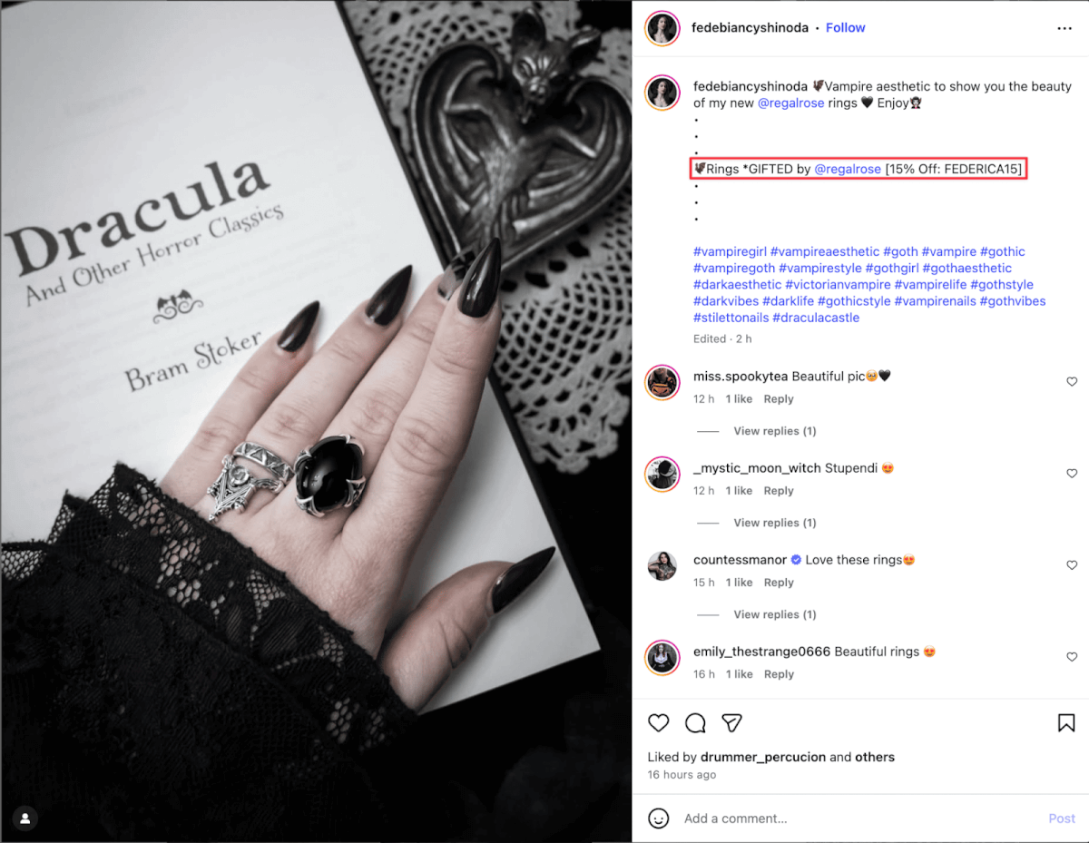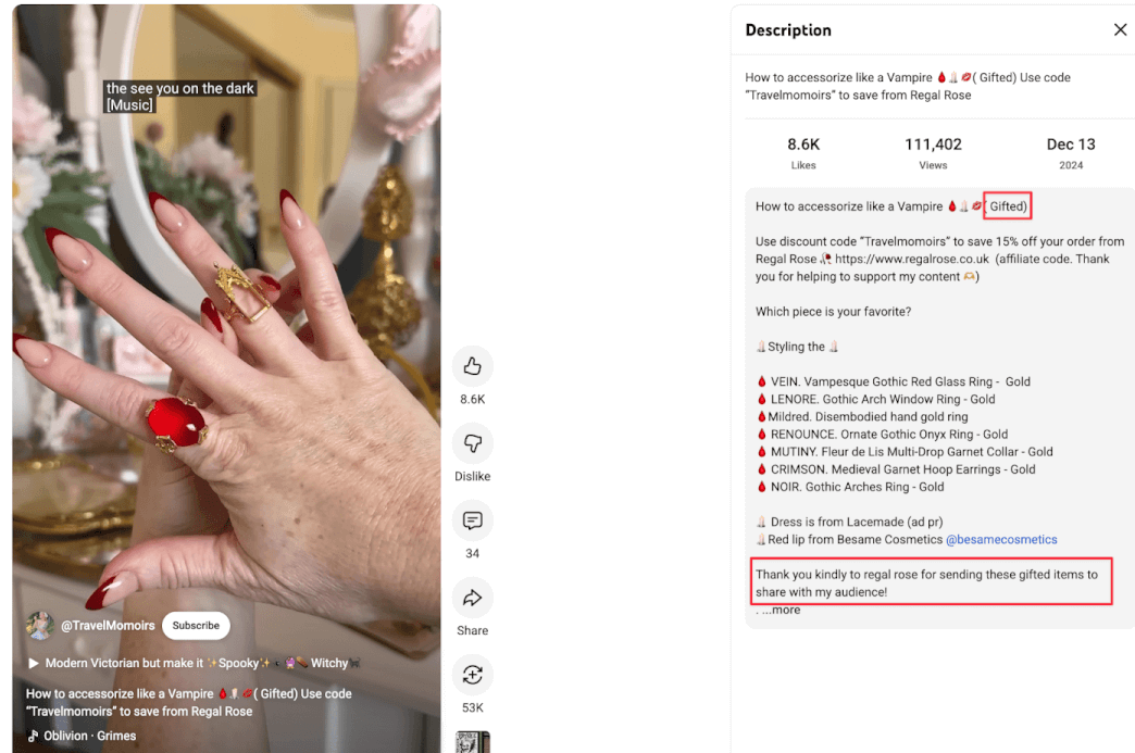 Regal Rose is a jewelry brand selling gothic accessories. Theyâre the master of influencer gifting â you can see #gifted posts from relevant influencers across Instagram, TikTok, and YouTube.