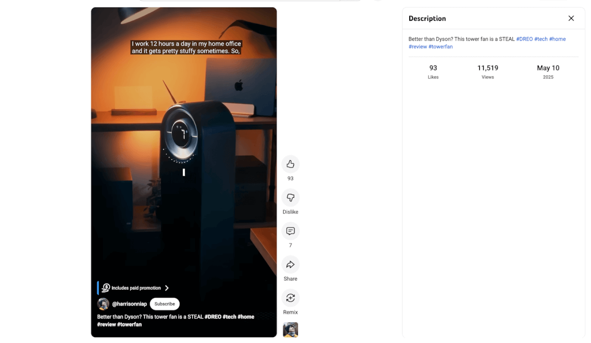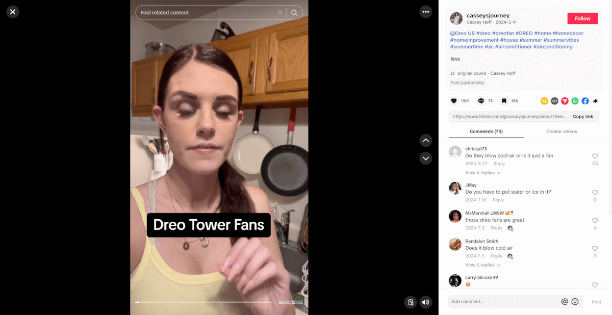 Their remote-controlled space heater is widely popular on TikTok Shop. Dreo has a network of affiliates promoting their fans and heaters via the Shop. All of that content is very casual and authentic. It isnât as polished as typical influencer content, but itâs a lot of people talking about their products.