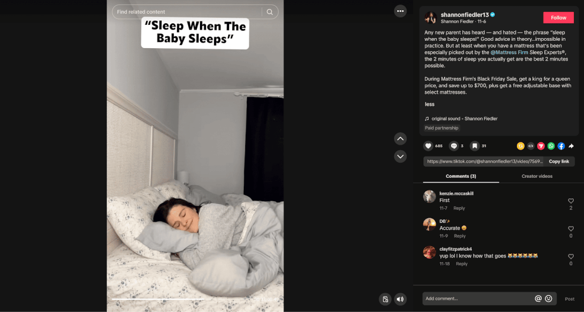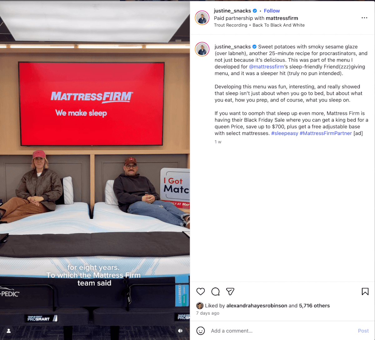 Mattress Firm sells various kinds of mattresses and uses fresh & creative influencer partners to promote their products.