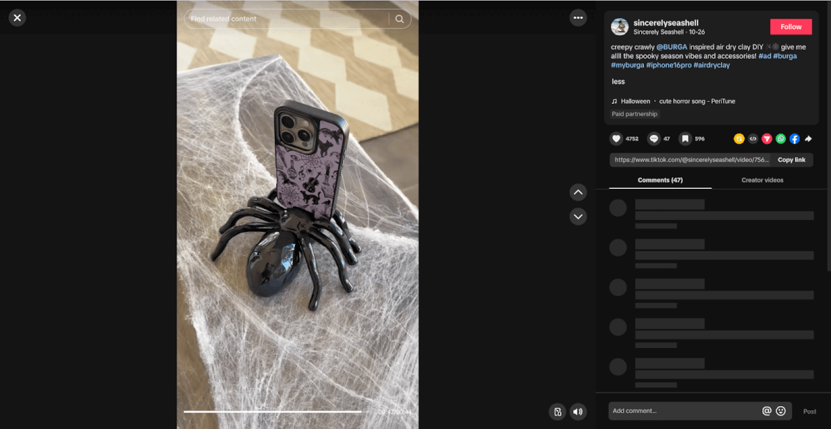 On TikTok, their brand awareness spend has shifted the influencer creativity to a whole new dimension. Take this creator who built a BURGA-inspired dry clay DIY spider for Halloween to match her phone case: