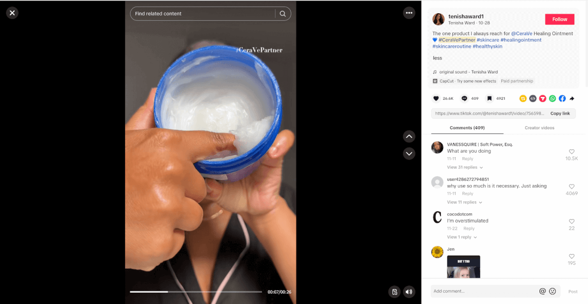 For example, on TikTok, a variety of creators promote various products in their catalog using the #ceravepartner hashtag. These influencers range from skincare creators to dermatologists to lifestyle influencers. The ambassadors promote everything from new product lines to holiday sales to unpopular products.