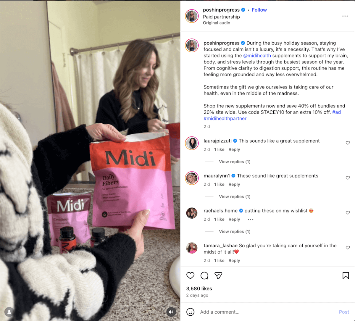 Midi Health is a health brand that sells supplements for women for menopause, weight, mood, sleep, and more. They partner with female creators in their midlife (their target customer) to promote their products.