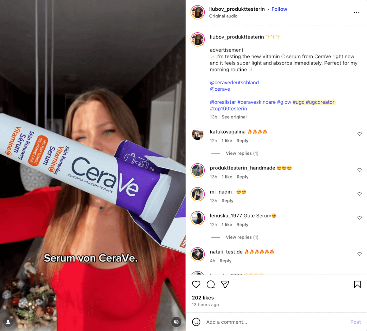Cerave also gifts its products to UGC creators in exchange for content and an honest review. Take the post below (originally in German) promoting the companyâs newly launched product.