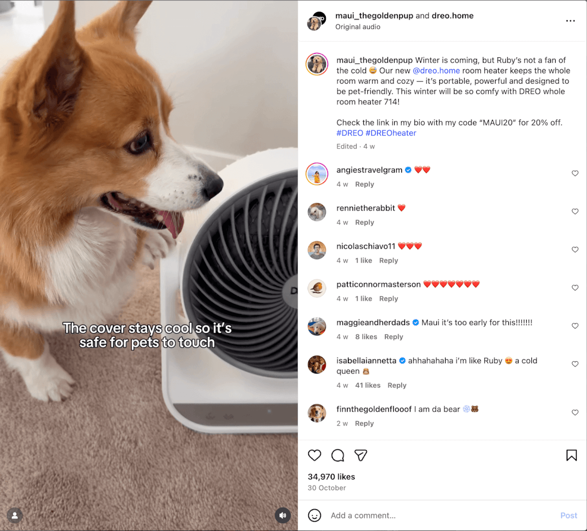 On Instagram, they partnered with my favorite pet influencer (I have a parasocial relationship with Maui, Ruby, and Hugo at this point). You wouldnât typically think of pets when marketing a space heater â which is what made the collab so refreshing. They have tons of such collaborations with different kinds of creators (mominfluencers, lifestyle creators, etc.).